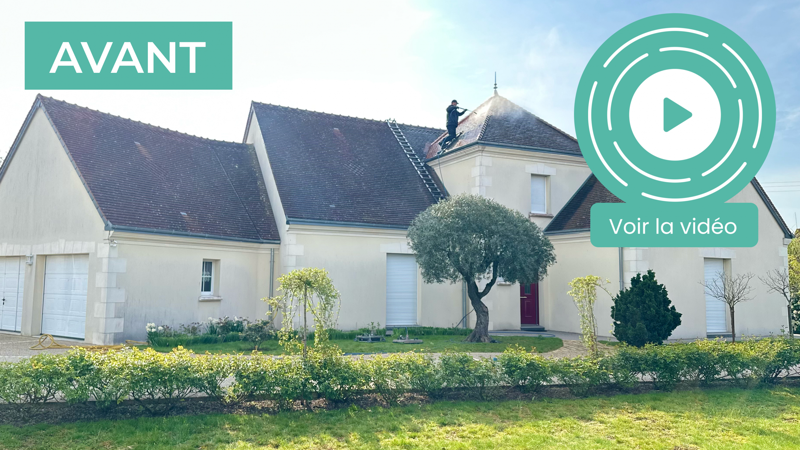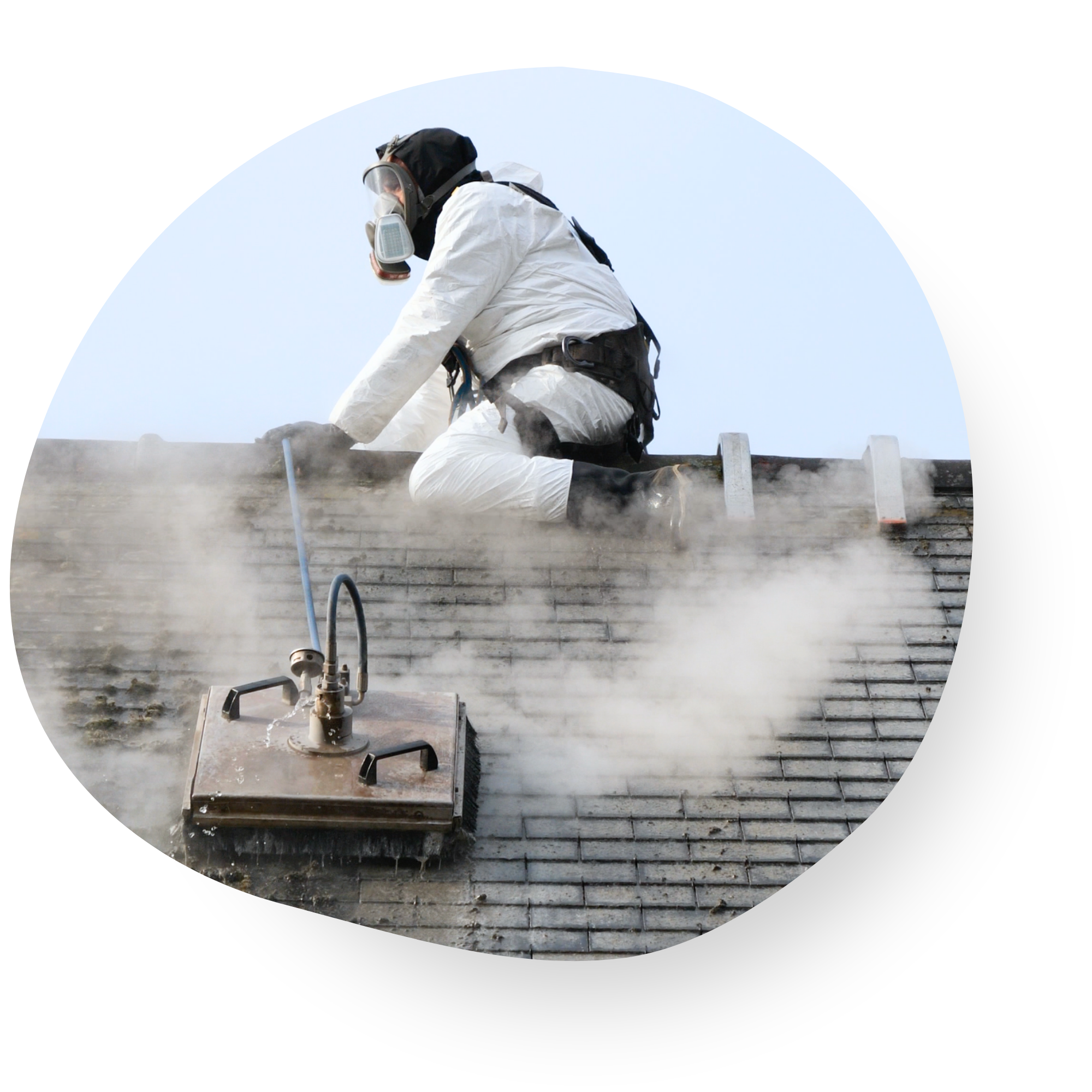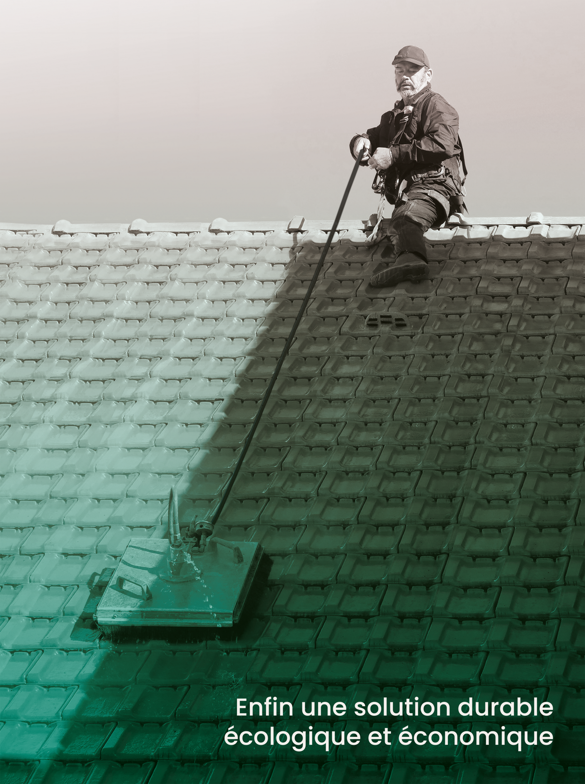 Vapeur d’eau, nettoyage en douceur. Efficacité supérieure qui permet un traitement 2x plus rapide. Le technicien opère depuis le faitage.