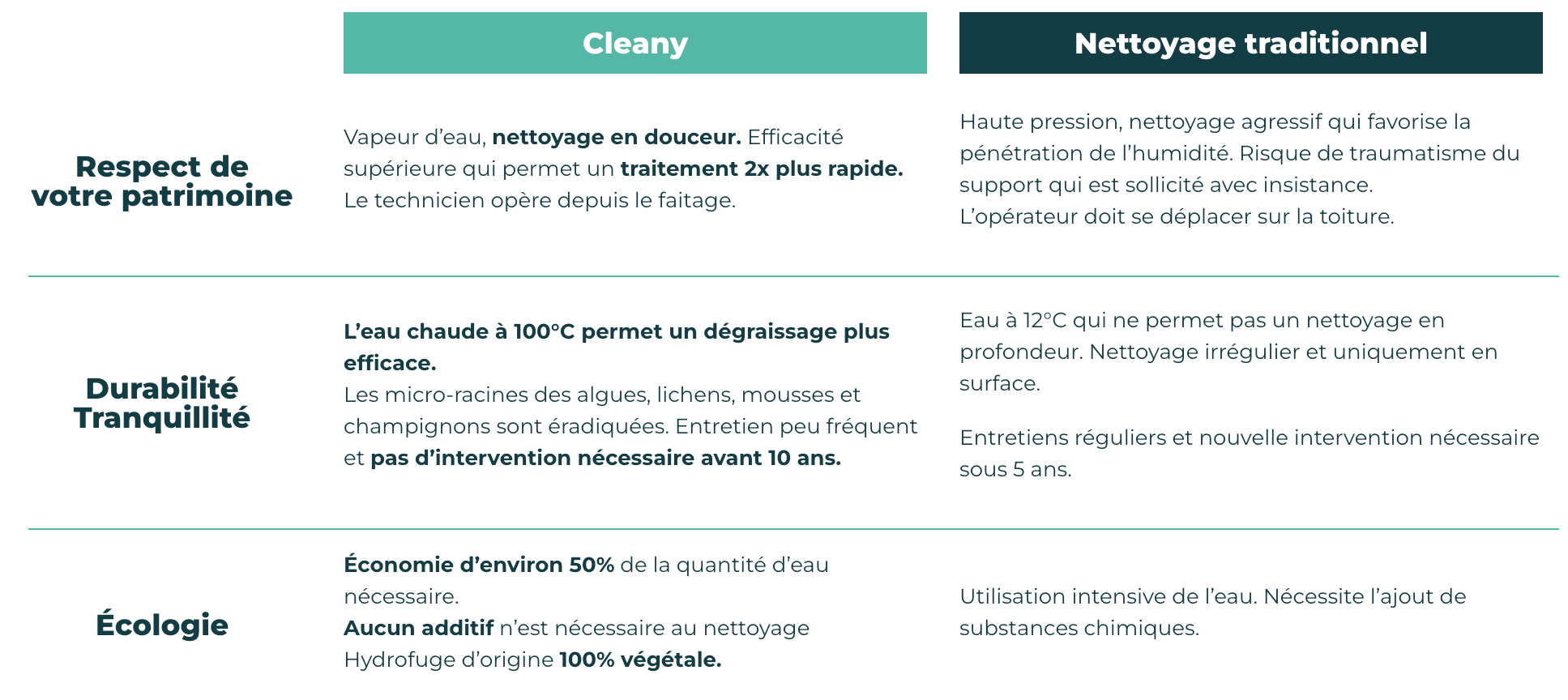 L’eau chaude à 100°C permet un dégraissage plus efficace. Les micro-racines des algues, lichens, mousses et champignons sont éradiquées. Entretien peu fréquent et pas d’intervention nécessaire avant 10 ans.